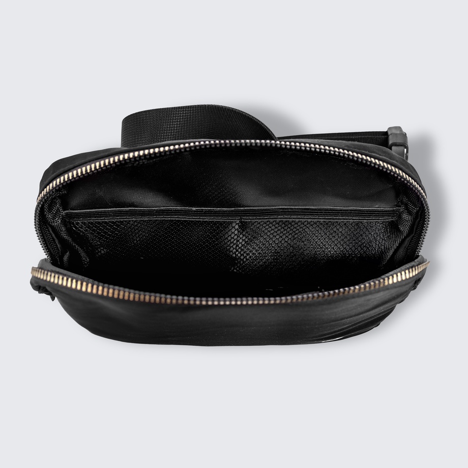 Our belt bag has a perfectly simple, sleek design & neutral black-and-gold colourway that goes with any style of outfit. Enjoy the convenience of keeping small items organized in the slim mesh pockets inside the main compartment, or in the passport-perfect pocket on the outside. Plus, the adjustable strap gives you the option to wear it around your waist or across your body, and its 1L capacity is plenty for all your essentials—so you can have everything on hand, while keeping your hands free!